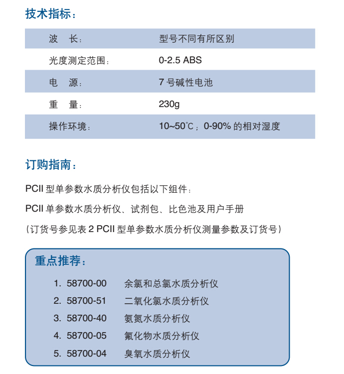 哈希公司推出了三十多种型号的PCII 系列单参数水质分析仪一PCII 系列袖珍比色计,不仅适用于野外现场水质测试,而且也适用于实验室内的水质分析。该系列产品是哈希公司按照国际规范化的检测方法进行预先编程,将标准曲线存入单参数水质分析仪中,在标准化的实验室内进行了出厂前的严格校准验证。该系列单参数水 质分析仪可进行一项或多项参数的测量,可直接显示测量结果。